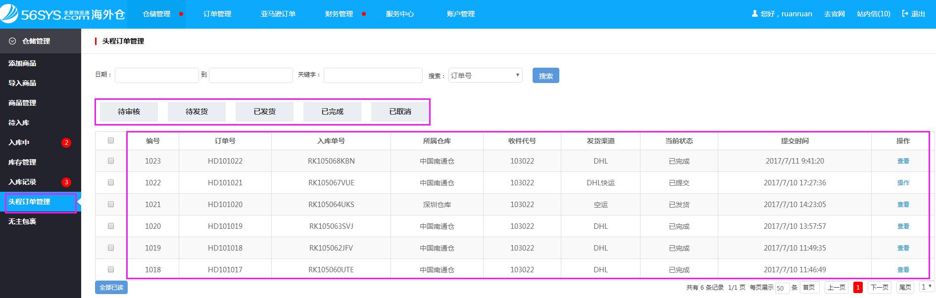 在“倉儲管理”——“頭程訂單管理”,列表查看所有“頭程訂單”的所有狀態(tài);