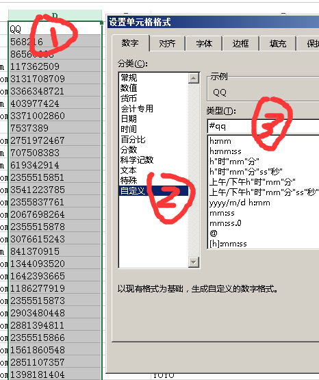在QQ列里點右鍵,點設(shè)置單元格屬性,然后選擇自定義,在類型這里輸入#qq,確定。