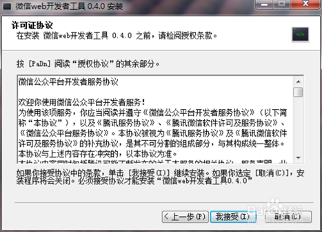2、同意微信WEB開發(fā)者工具,點(diǎn)擊“我接受”進(jìn)入下一步安裝;