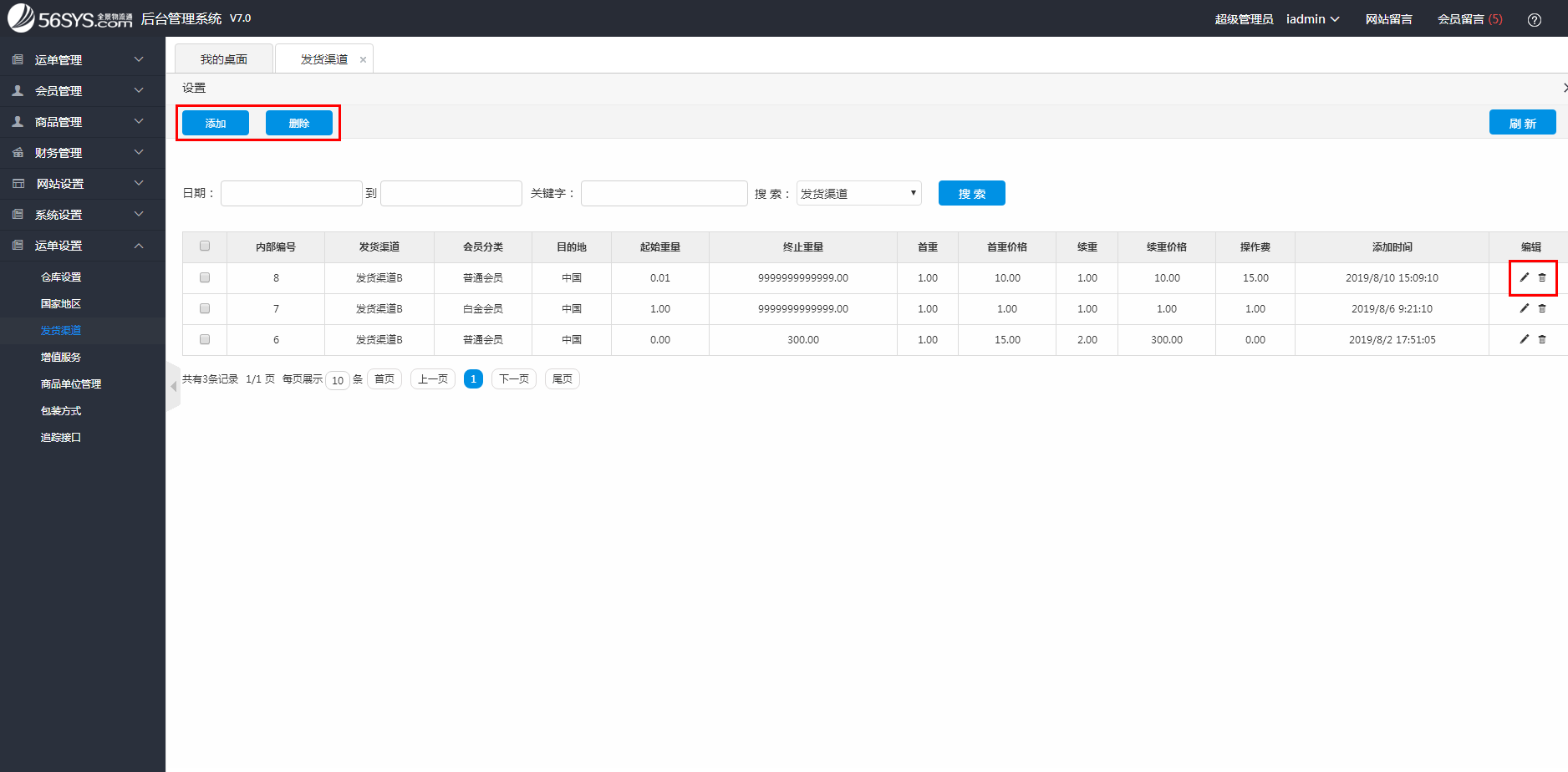 集運(yùn)系統(tǒng) 添加、刪除、修改發(fā)貨渠道