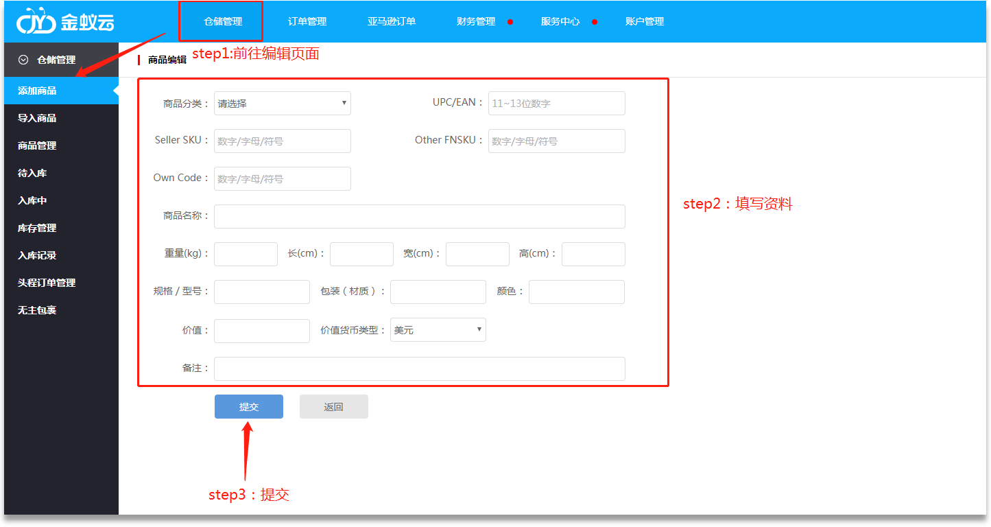 ·前往【倉儲管理】-【添加商品】進行商品編輯,按要求填寫資料,點擊【提交】,后臺即可成功添加商品。