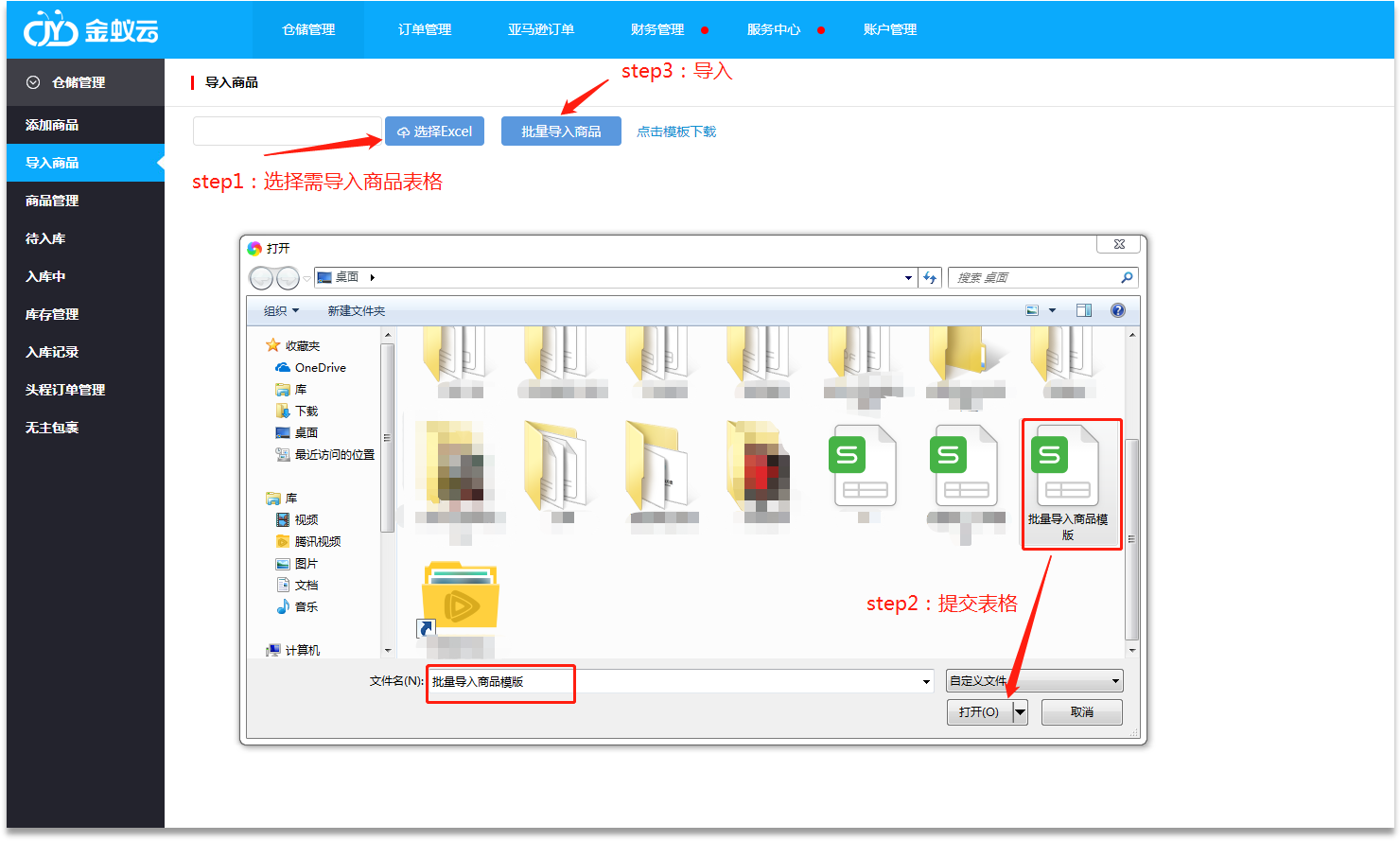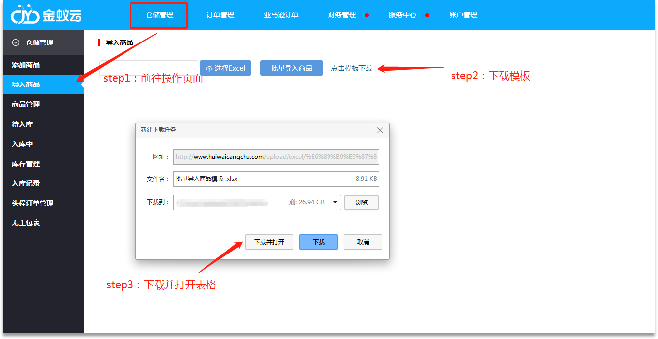 ·前往【倉儲(chǔ)管理】-【導(dǎo)入商品】頁面,點(diǎn)擊【點(diǎn)擊下載模板】。