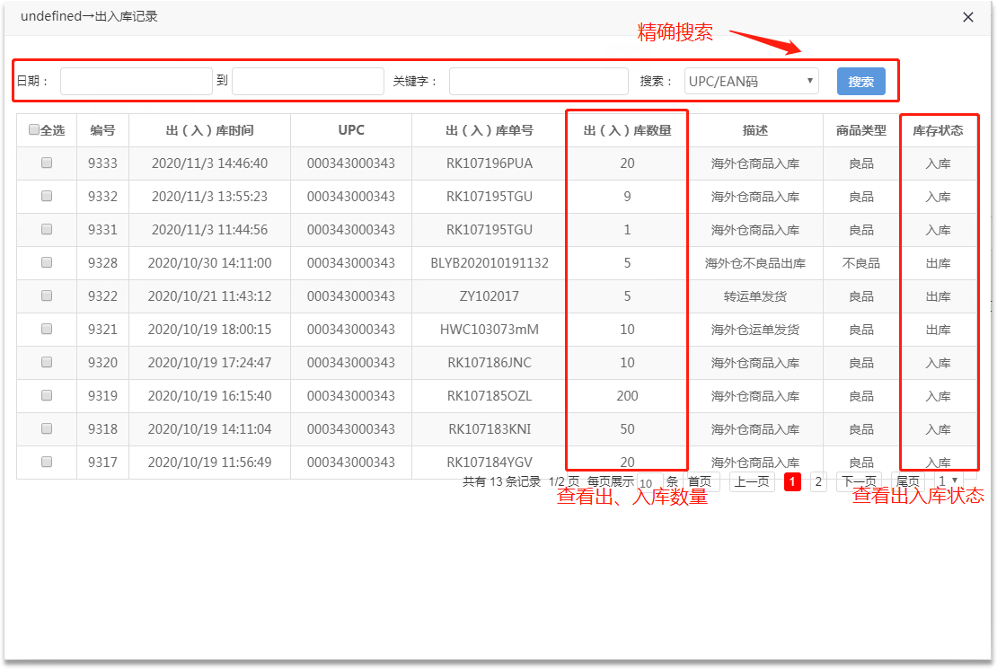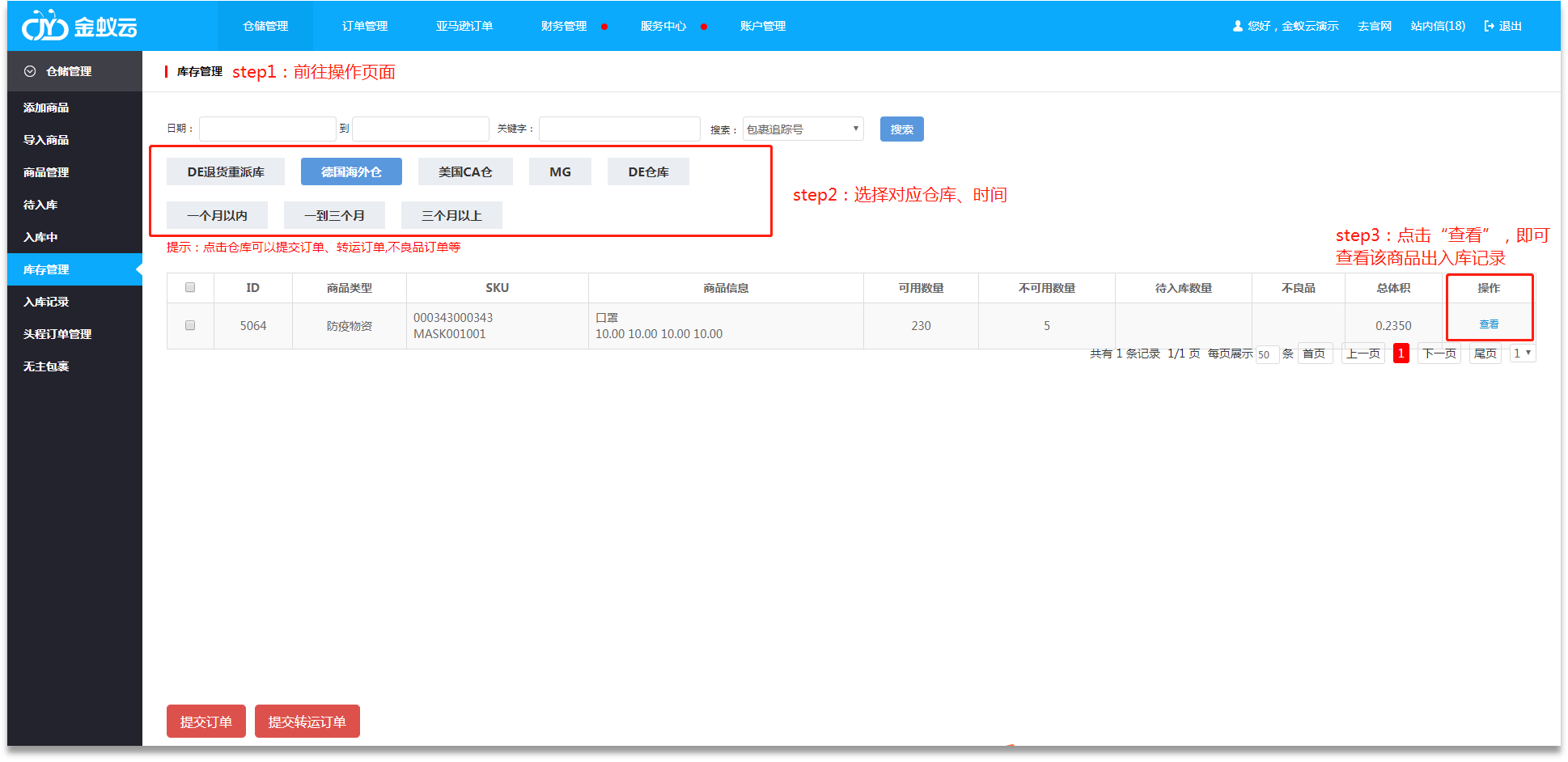 ·在【倉儲(chǔ)管理】-【庫存管理】選擇商品點(diǎn)擊【查看】,即可查詢該所選商品出入庫記錄。