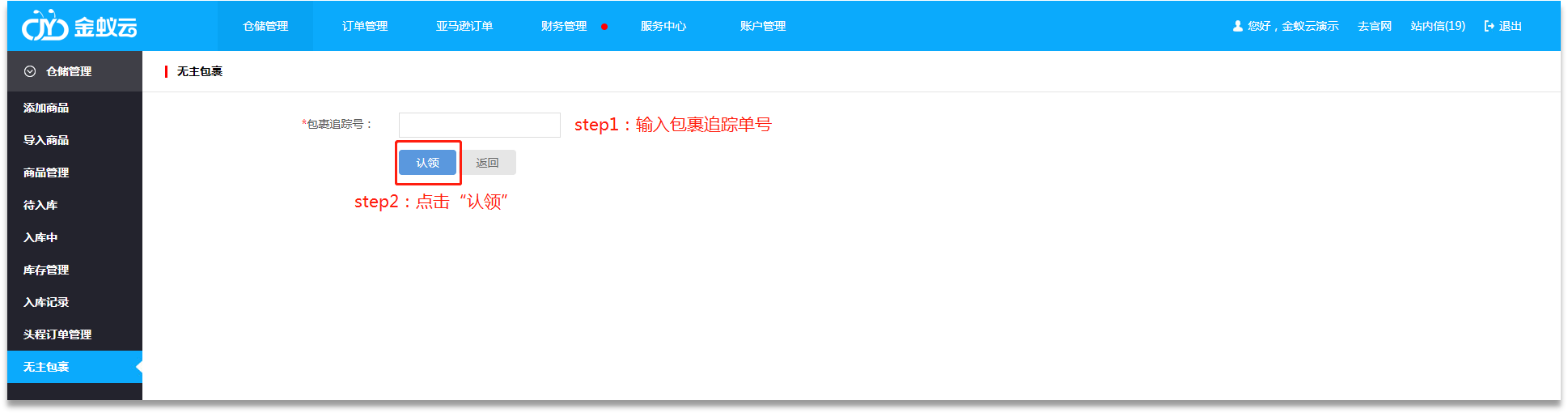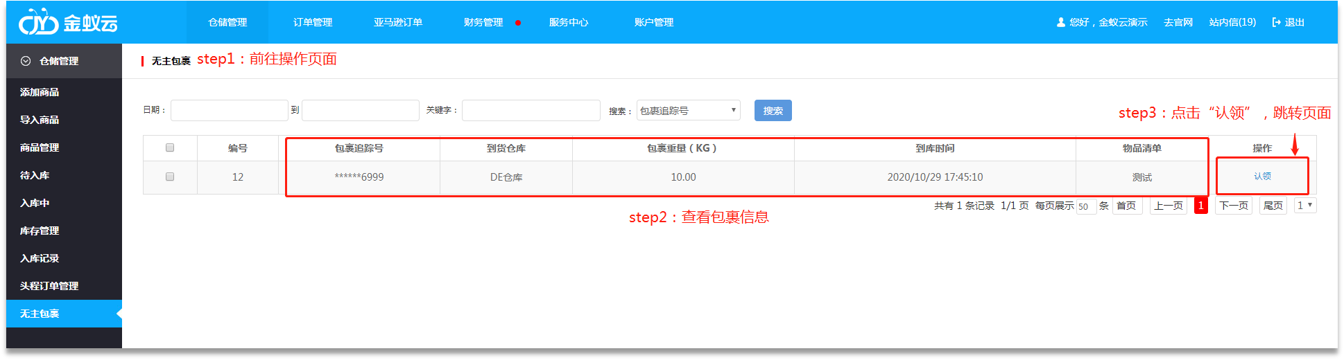 ·管理員會(huì)將無(wú)人認(rèn)領(lǐng)的包裹進(jìn)行系統(tǒng)發(fā)布,用戶可前往【倉(cāng)儲(chǔ)管理】-【無(wú)主包裹】核對(duì)包裹信息,進(jìn)行認(rèn)領(lǐng)。