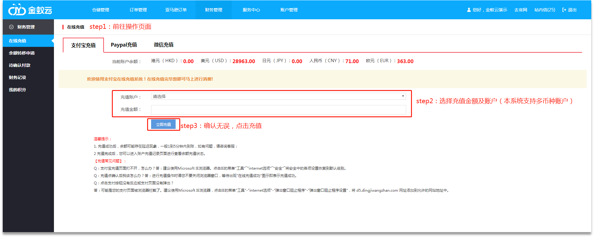 ·本系統(tǒng)支持支付寶、微信、paypal三種渠道充值,用戶(hù)可在【財(cái)務(wù)管理】-【在線充值】頁(yè)面進(jìn)行充值操作。