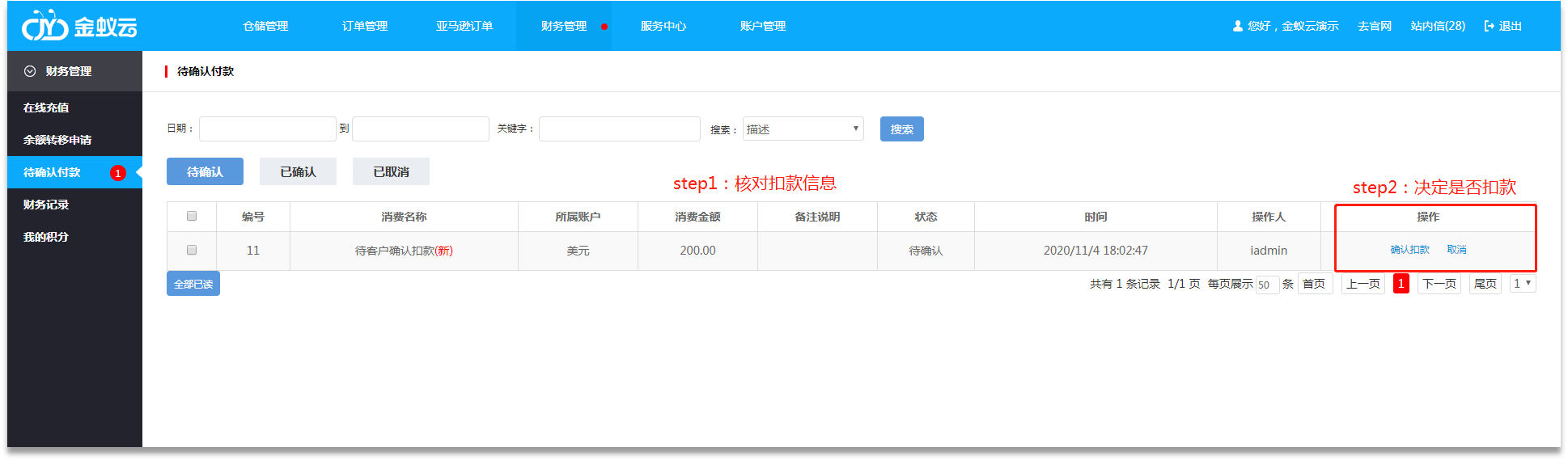 ·本系統(tǒng)扣款方式分為“自動(dòng)扣款”和“待客戶確認(rèn)扣款”;當(dāng)出現(xiàn)待確認(rèn)扣款時(shí),系統(tǒng)會(huì)提示用戶前往【財(cái)務(wù)管理】-【待確認(rèn)付款】進(jìn)行操作。
