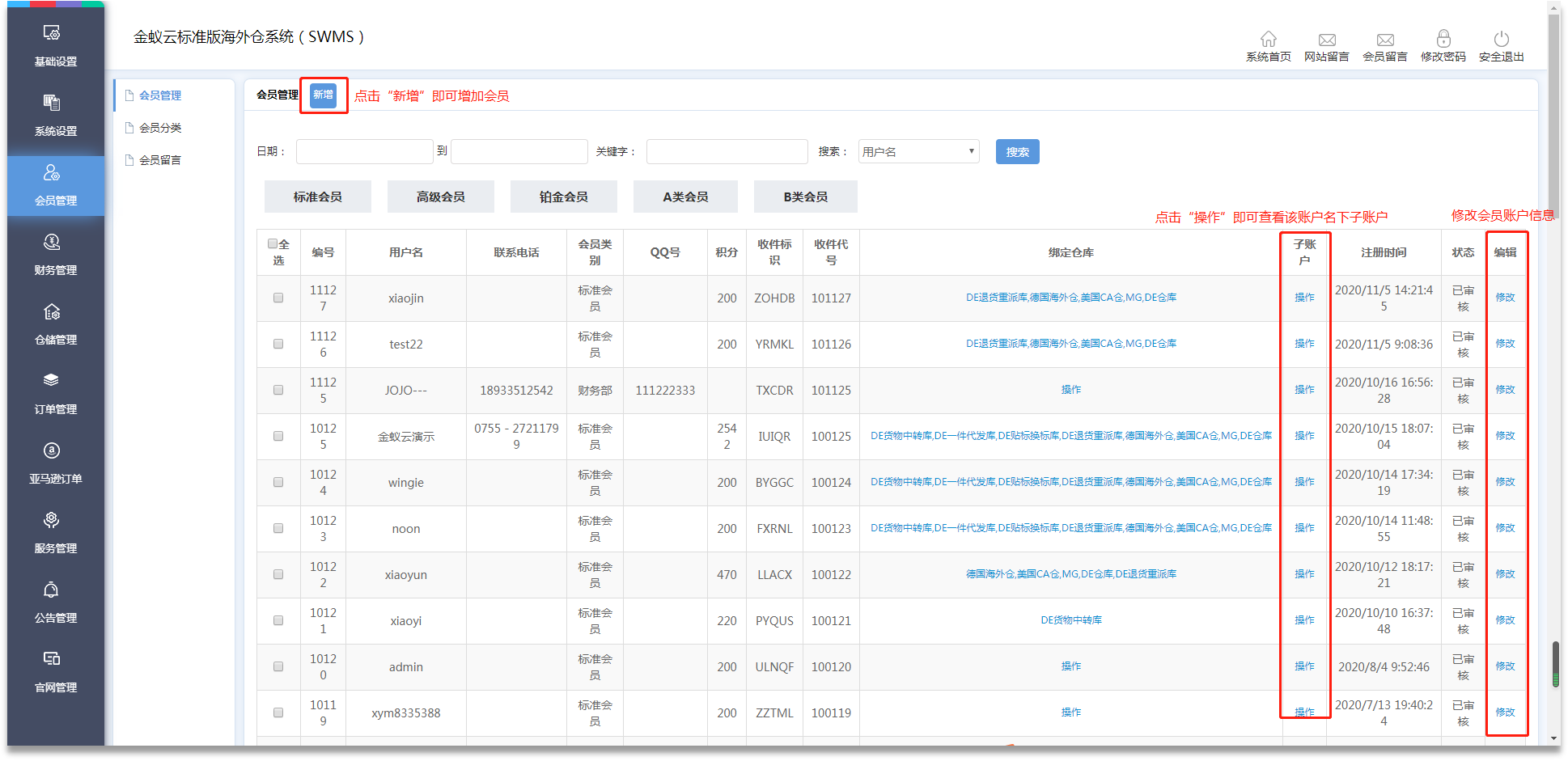 ·前往【會員管理】頁面,管理員可實現會員分類設置、會員管理及查看會員留言。