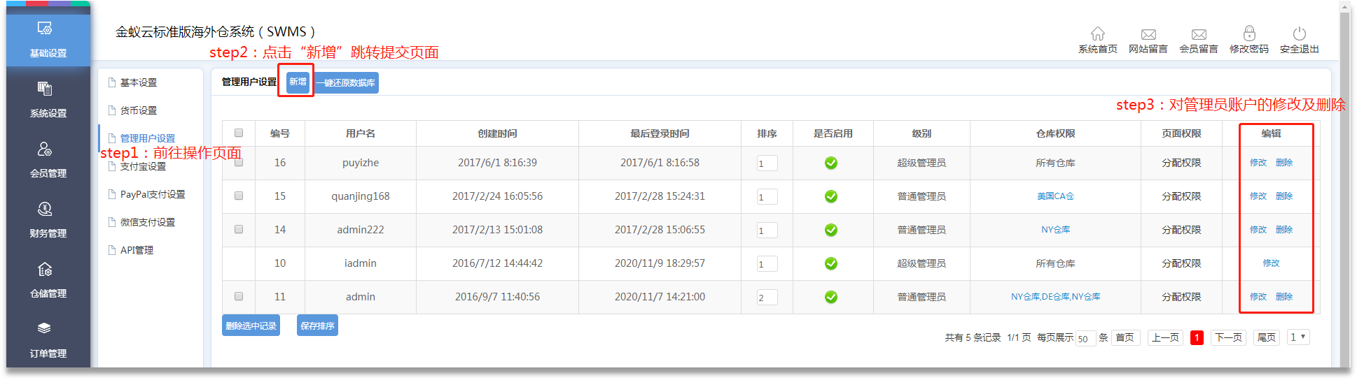 ·前往【基礎設置】-【管理管理員設置】,可進行系統(tǒng)管理員的管理,包括新增、權限分配、修改及刪除。