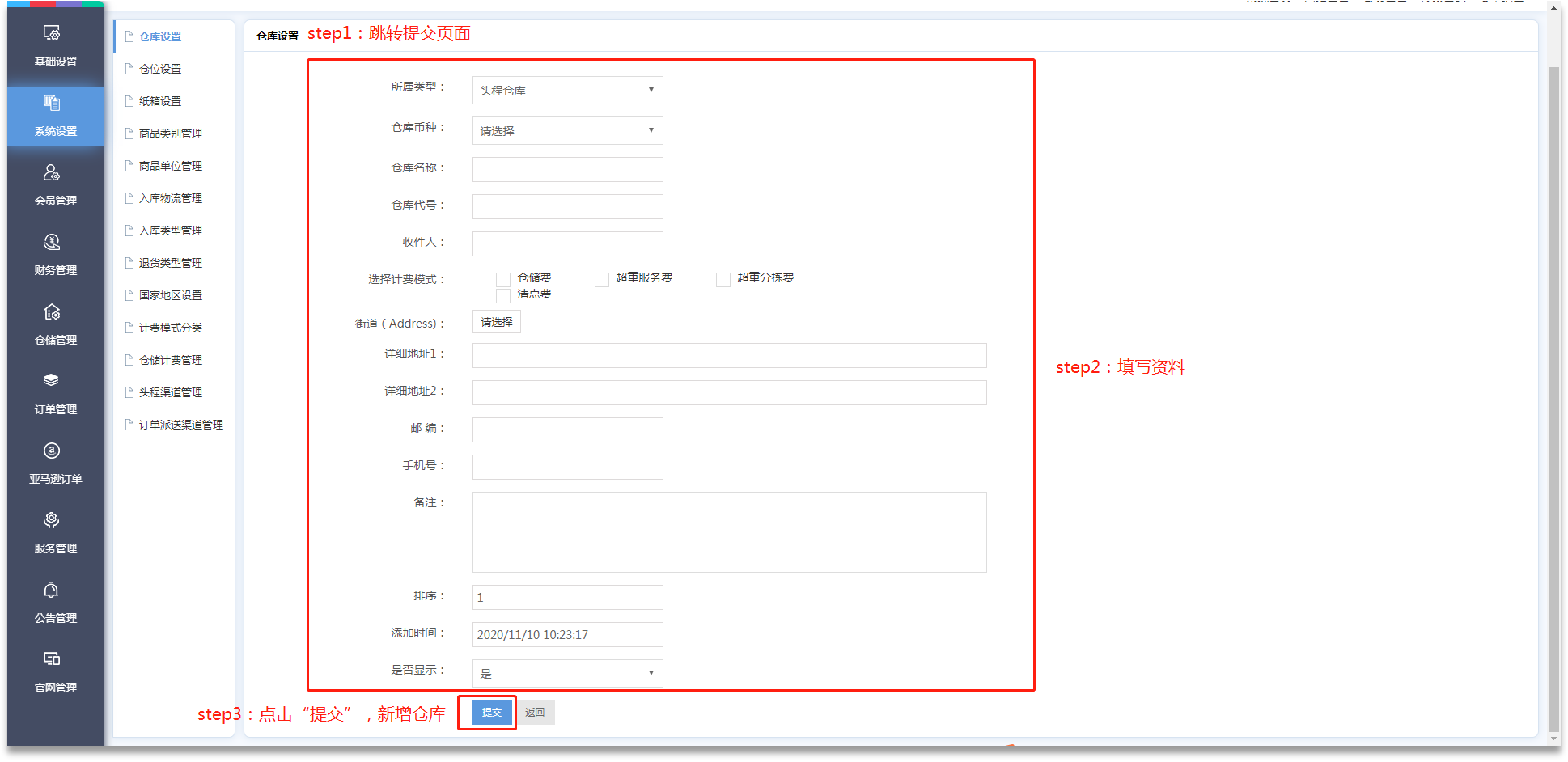 ·管理員可在【系統(tǒng)設(shè)置】-【紙箱設(shè)置】、【計費模式分類】、【倉儲計費管理】進(jìn)行費用設(shè)置;在【商品類別管理】、【商品單位管理】進(jìn)行商品設(shè)置;在【入庫類型管理】、【退貨類型管理】進(jìn)行入庫類型設(shè)置;在【國家地區(qū)設(shè)置】進(jìn)行地址設(shè)置及導(dǎo)入。