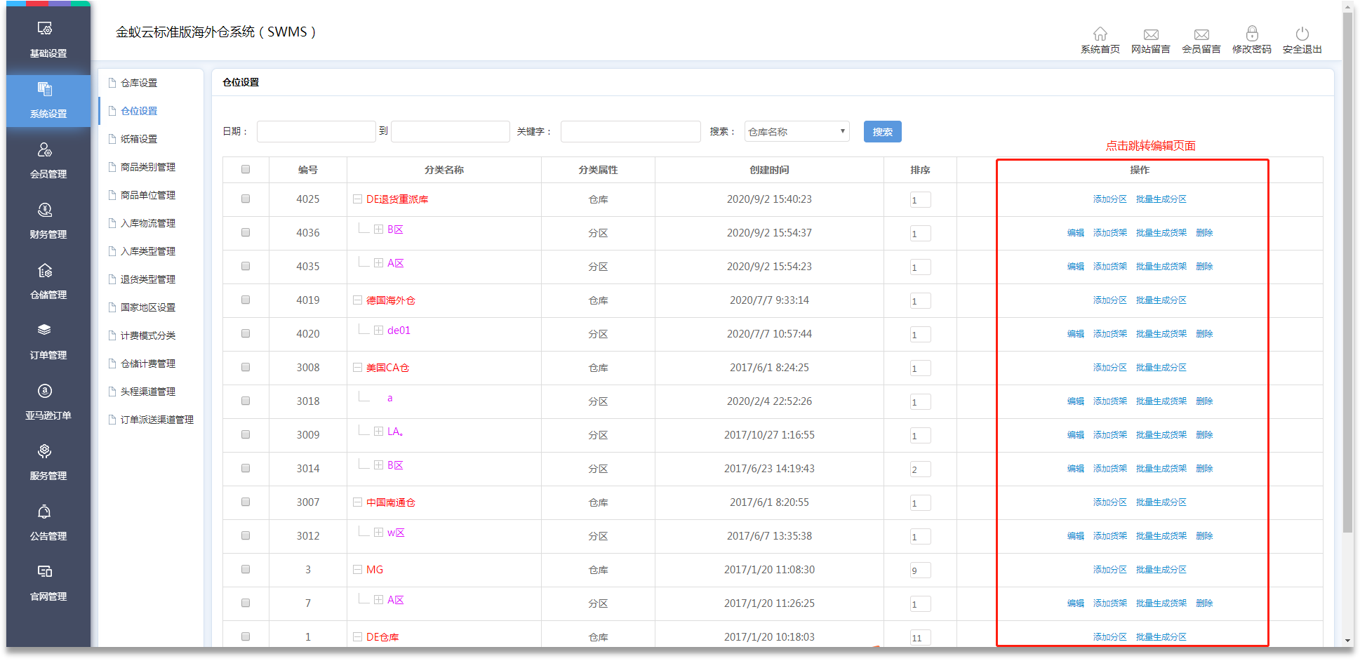 倉位設(shè)置管理頁面