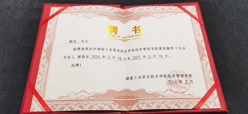 2024年3月19日,楊全總經(jīng)理受邀參加母校的“校友回湘”活動(dòng),同時(shí)被聘請(qǐng)為湖南工業(yè)職業(yè)技術(shù)學(xué)院兼職教師(行業(yè)企業(yè)),。