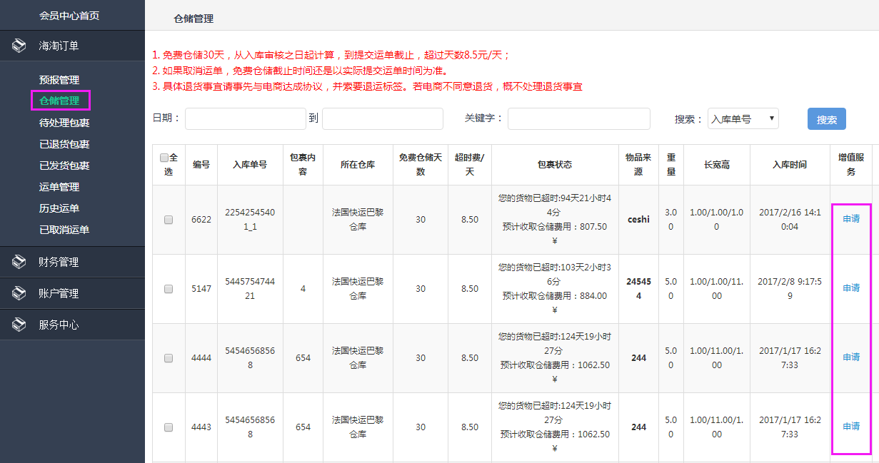結(jié)合海淘轉(zhuǎn)運(yùn)實(shí)際情況,此功能主要用于倉(cāng)庫(kù)收到包裹后,客戶(會(huì)員)可對(duì)已經(jīng)入庫(kù)還未發(fā)貨的包裹,提交增值服務(wù)申請(qǐng);