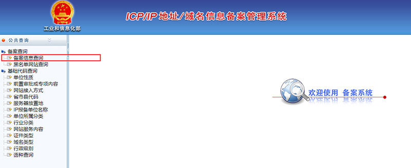 1、進(jìn)入工信部備案管理系統(tǒng)(網(wǎng)頁鏈接),點(diǎn)擊左邊菜單的“備案查詢”。