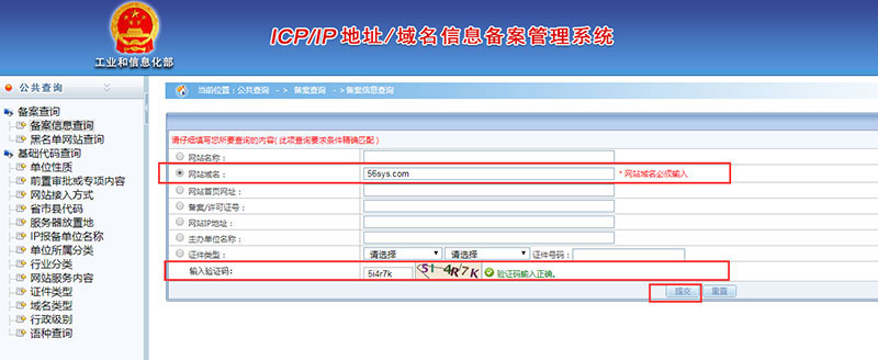 2、在備案信息查詢頁面,輸入網(wǎng)站域名及驗(yàn)證驗(yàn),點(diǎn)擊“提交”按鈕。